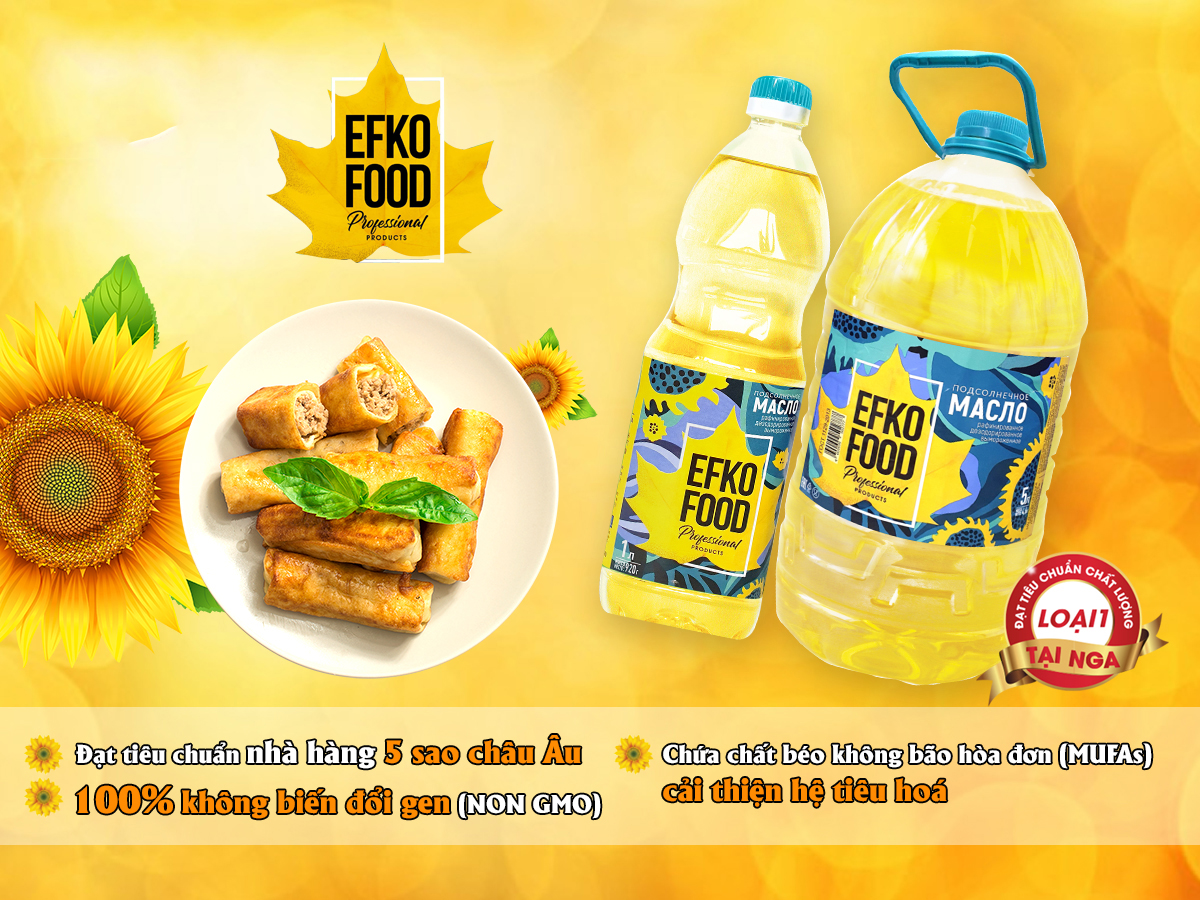 - Dầu ăn hướng dương EFKO Food Professional sản xuất từ 100% hạt hướng dương nguyên chất, được tuyển chọn kỹ lưỡng từ các nông trại của Liên Bang Nga Sản phẩm là nguồn cung cấp dồi dào các axit béo không no, chất khoáng, chất xơ, các Vitamin E, Omega 6, Omega 9 mang đến cuộc sống tràn đầy năng lượng. - Đạt tiêu chuẩn chất lượng loại 1 tại Liên bang Nga