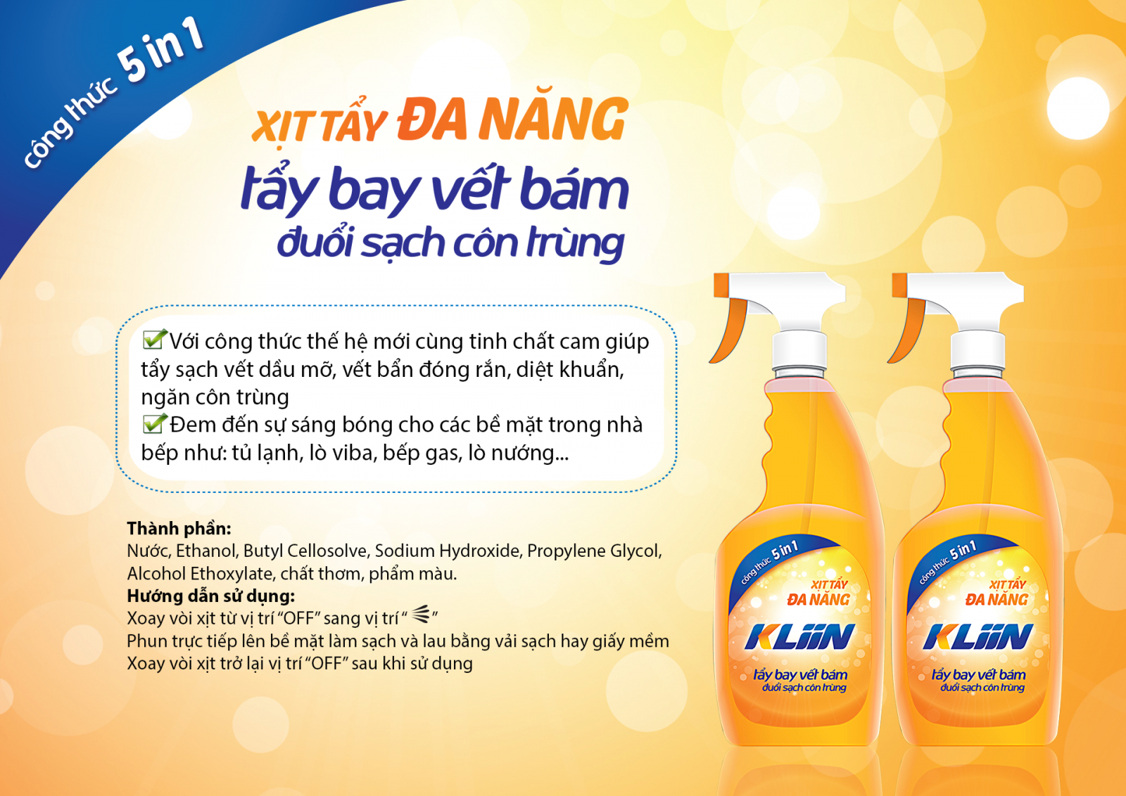 - Với công thức thế hệ mới cùng tinh chất cam giúp tẩy sạch vết dầu mỡ, vết bẩn đóng rắn và hỗ trợ diệt khuẩn, ngăn côn trùng.